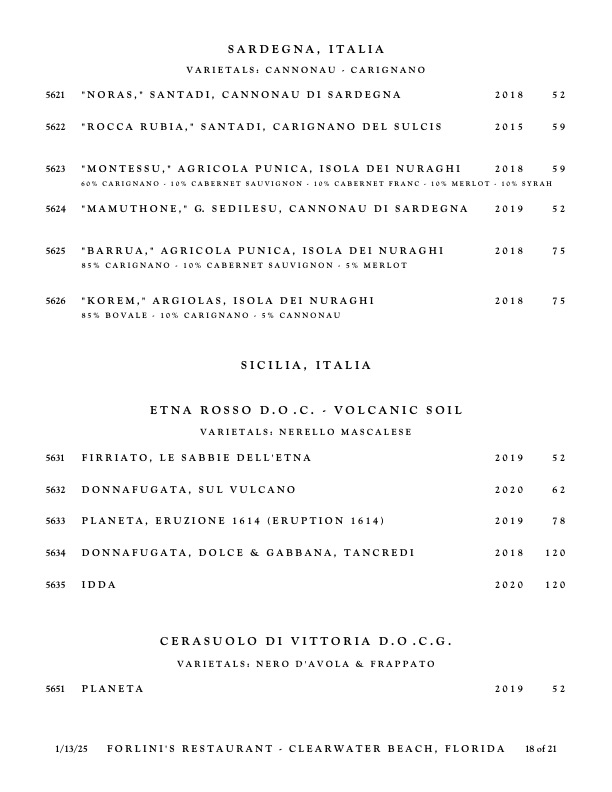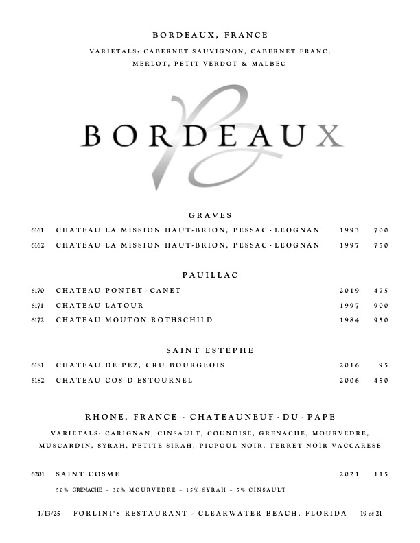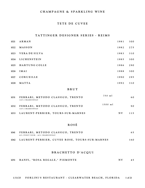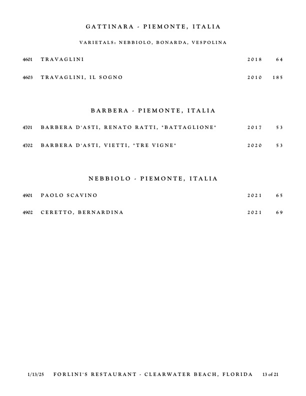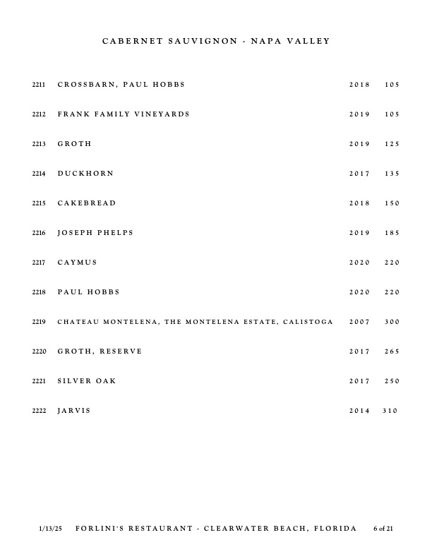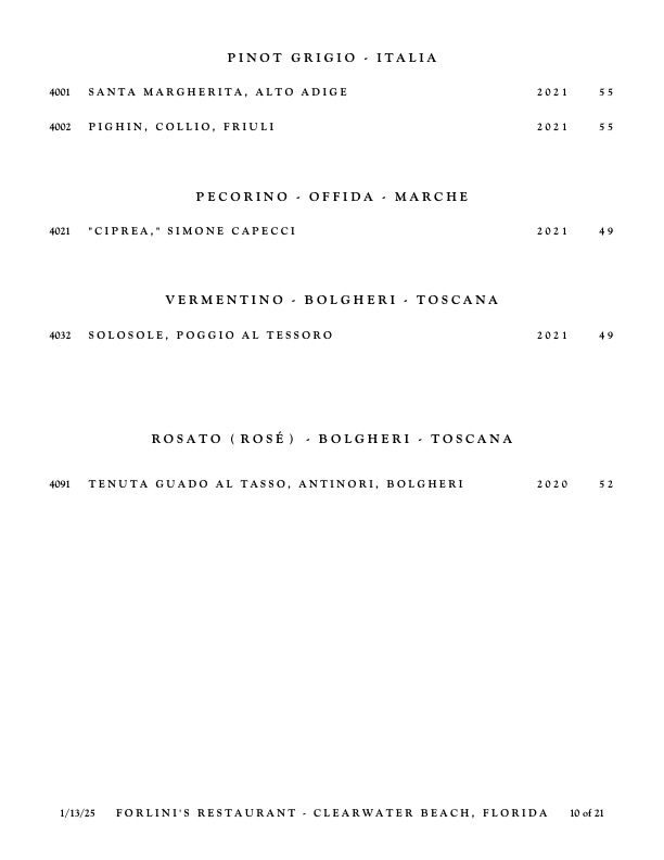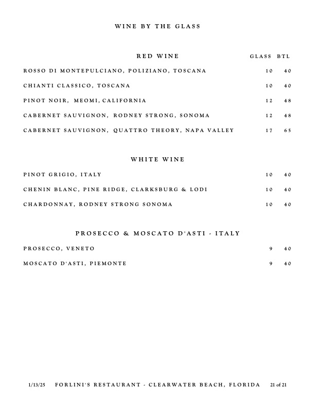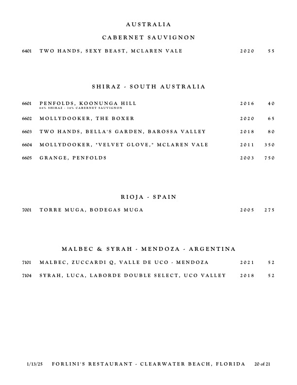 FORLINI’S makes every effort to ensure that wine list items, vintages and prices listed on our website are up to date and correct. However, items, vintages and prices listed on our WEBSITE MENU are NOT GUARANTEED and are subject to change without notice.